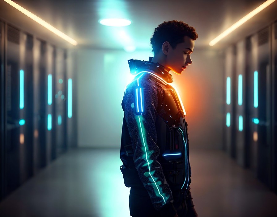 Futuristic humanoid robot in dimly lit corridor with glowing lights