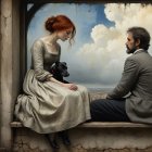 A man and woman sit together on a ledge, gazing contemplatively into the distance. A black dog sits beside them, with a backdrop of dramatic clouds and a cityscape below.