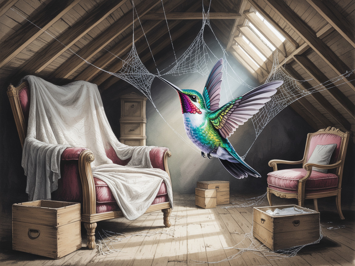 A vibrant bird hovers in a dusty attic, filled with soft light. Cobwebs stretch across the beams, and old furniture sits amongst forgotten boxes, creating a nostalgic yet lively atmosphere.