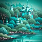 A vibrant, surreal landscape featuring towering, oversized trees in shades of teal and turquoise, alongside lush vegetation and a shimmering river, all under a mystical, colorful sky.
