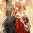 A graceful woman stands with her back to the viewer, wearing a flowing red skirt and white decorations, about to bathe. The abstract background contains soft shades, enhancing the elegance of the pose.