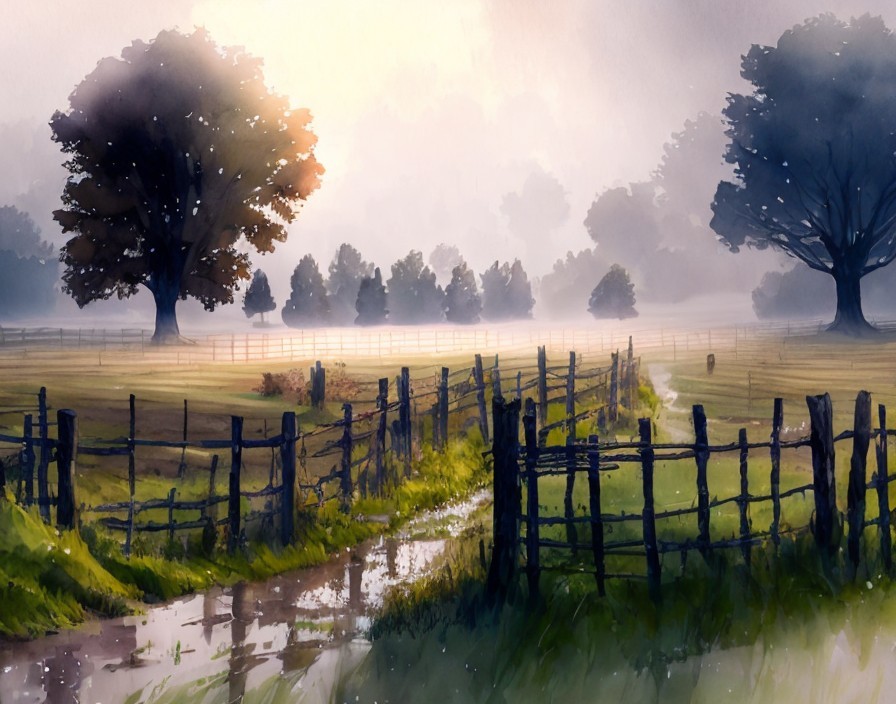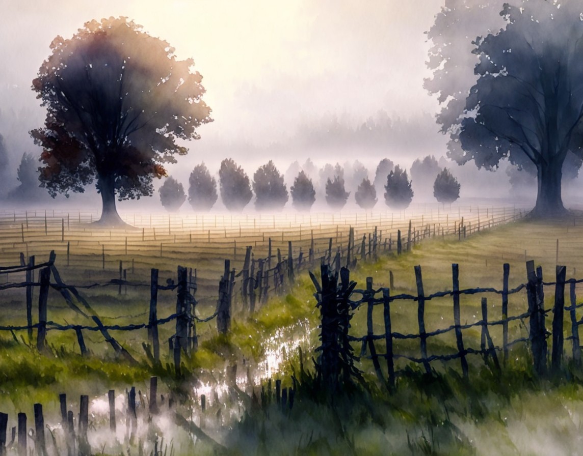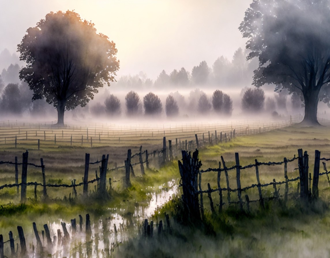 Misty Dawn Landscape with Sunlit Haze and Trees