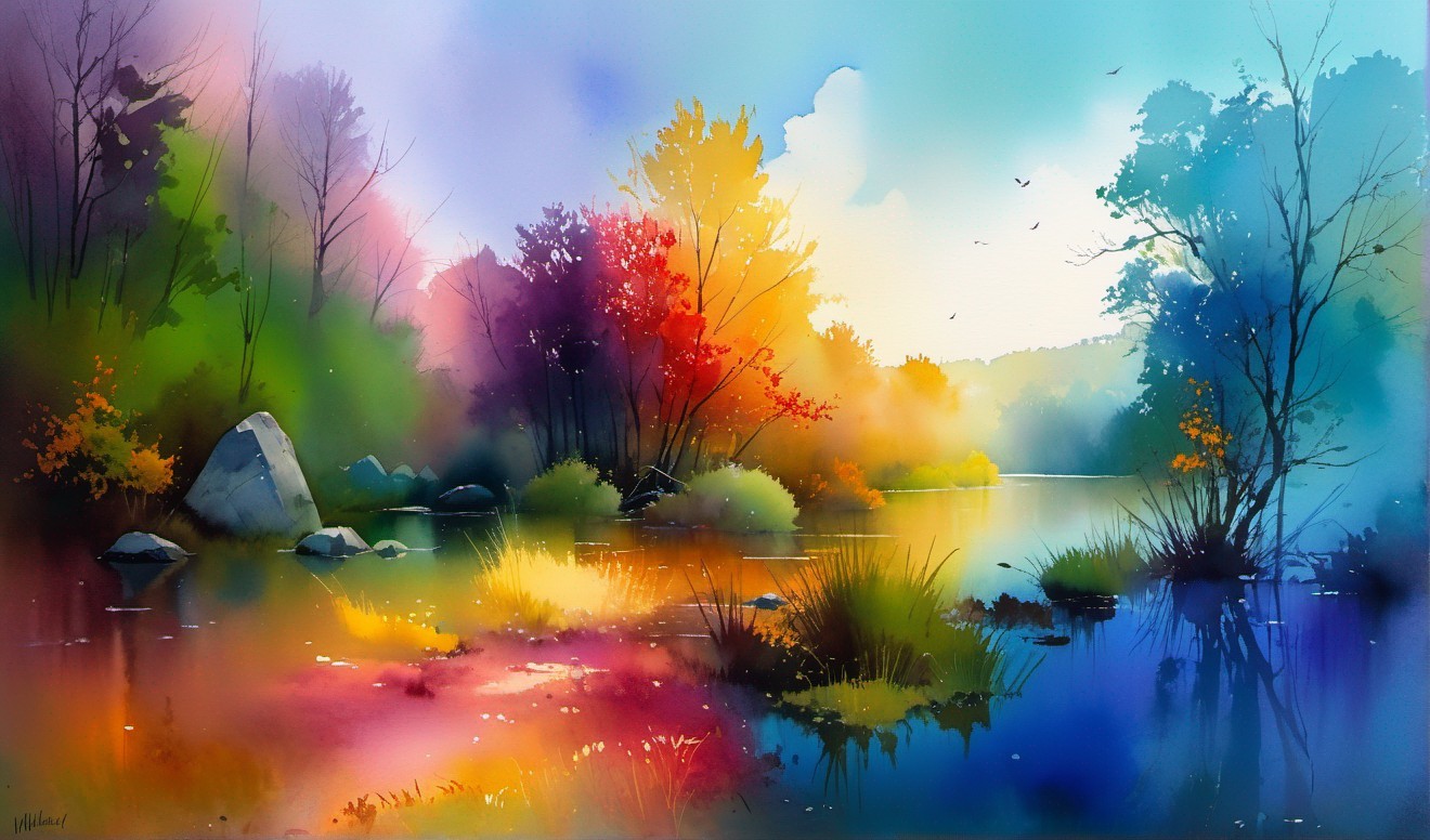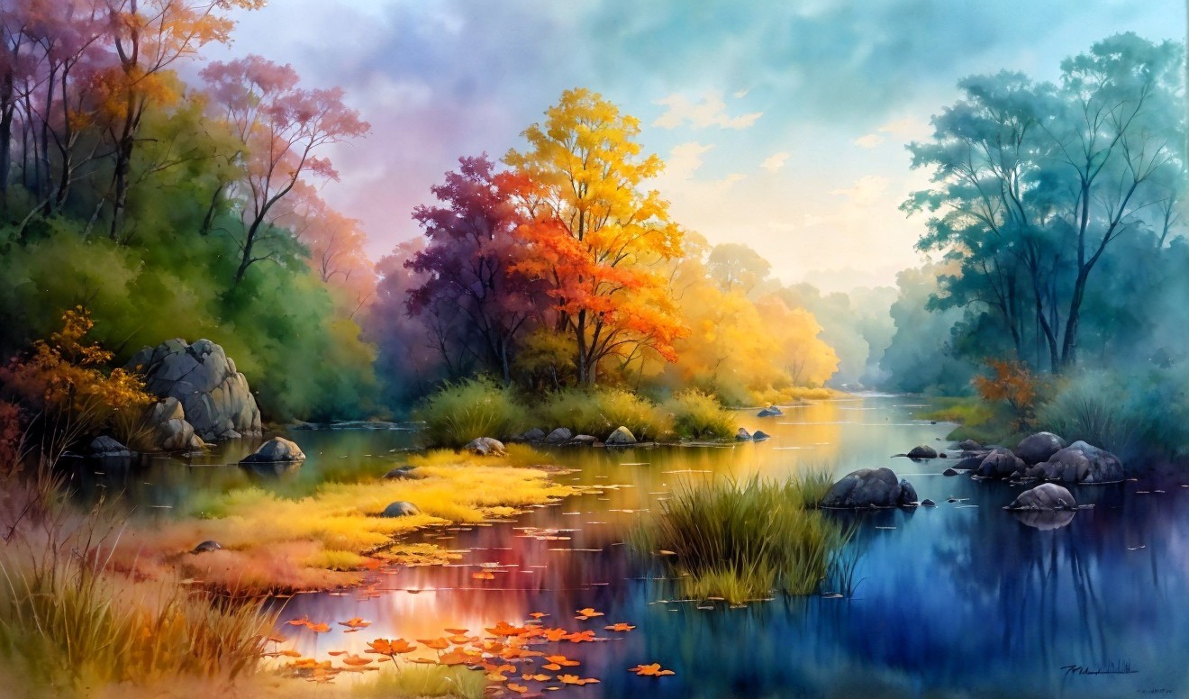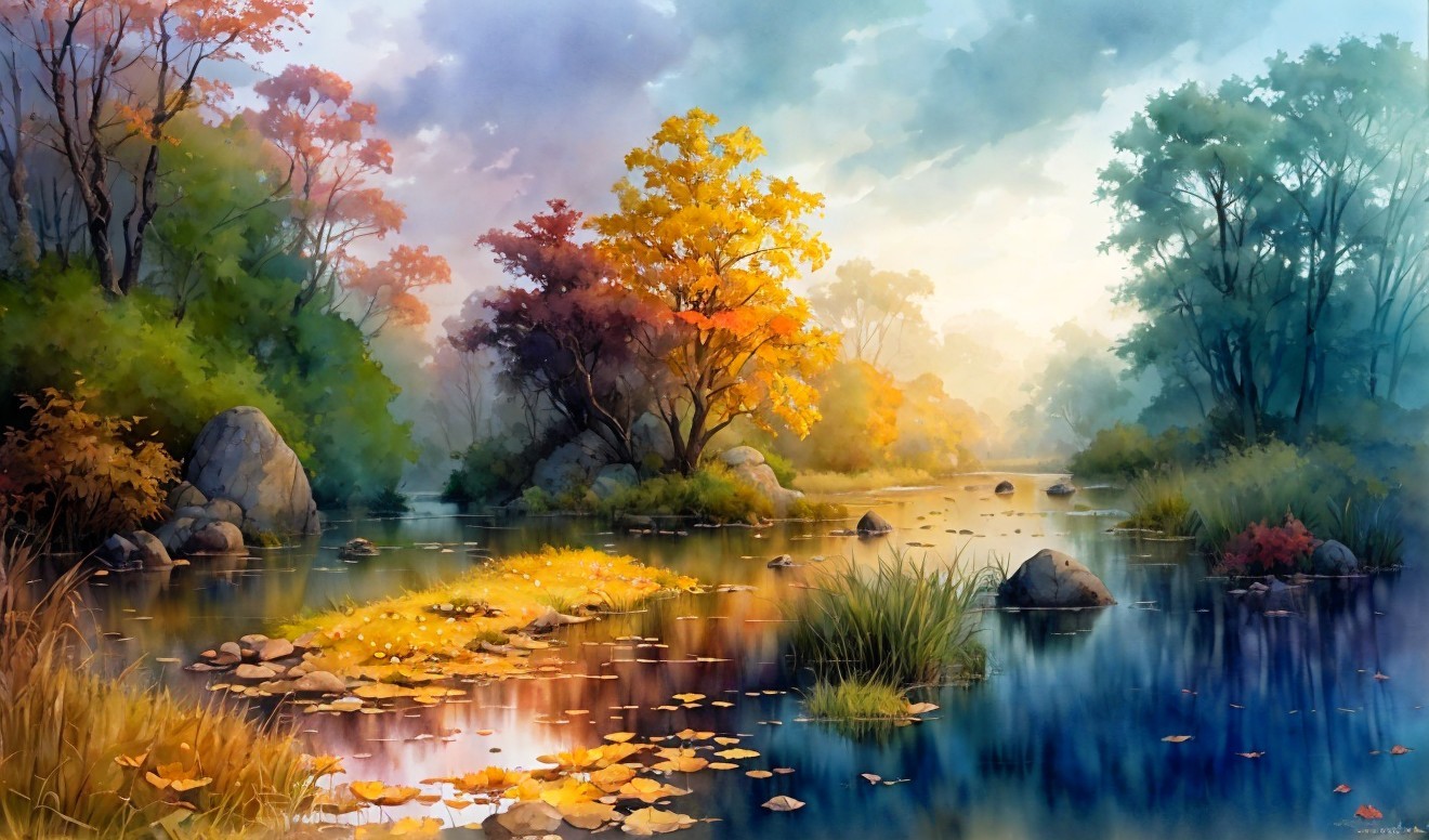 + Prompt:beautiful intricate wetland with boulders and autumn trees, soft delicate watercolor, dramatic, perfect composition, hdr, by Thomas Wells Schaller