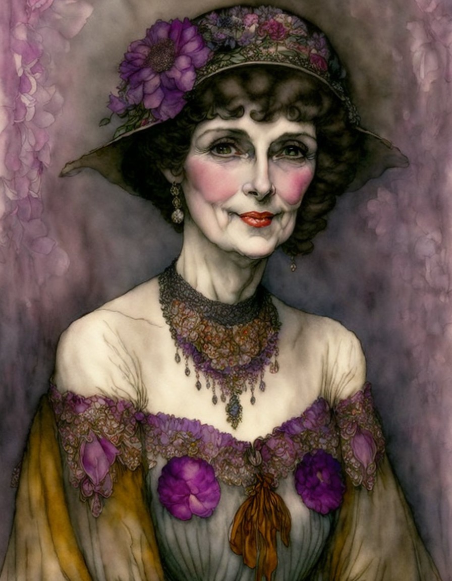 A graceful woman with a warm smile, adorned in a colorful dress. She wears an elegant floral headpiece and sparkling jewelry, exuding charm and sophistication in a vintage style.