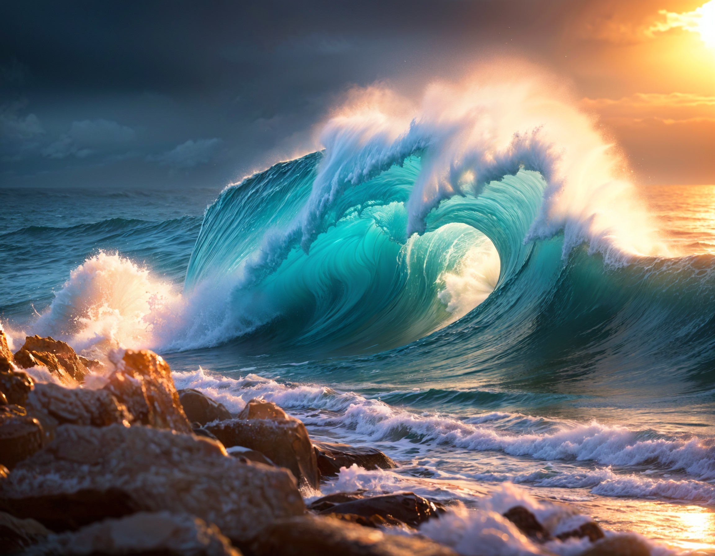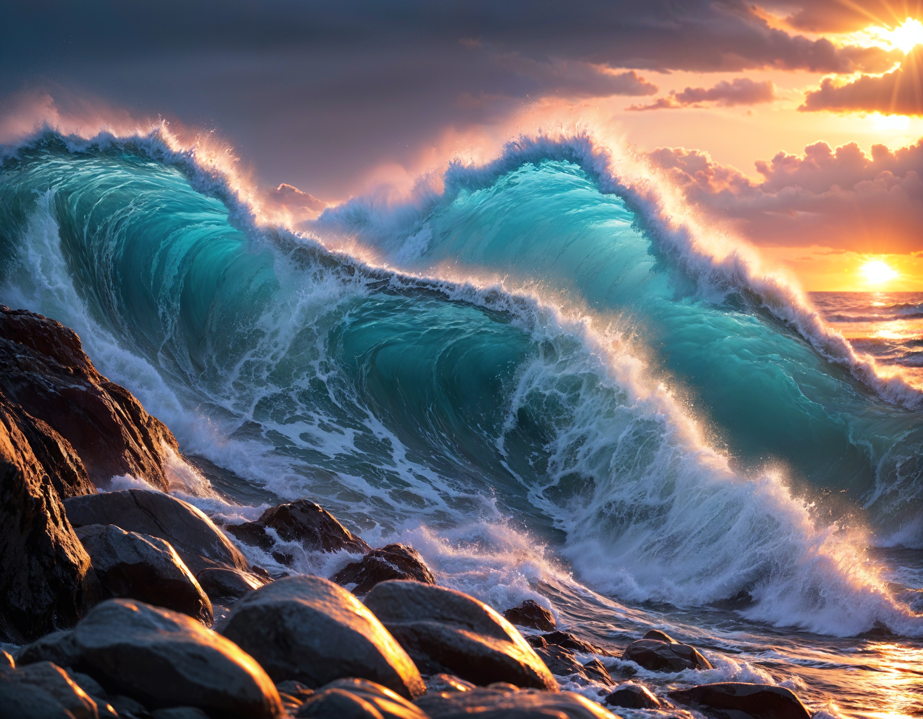 Crashing waves rise dramatically against rocky surfaces, illuminated by a warm sunset. The swirling turquoise water contrasts beautifully with the moody sky, creating a stunning coastal scene.
