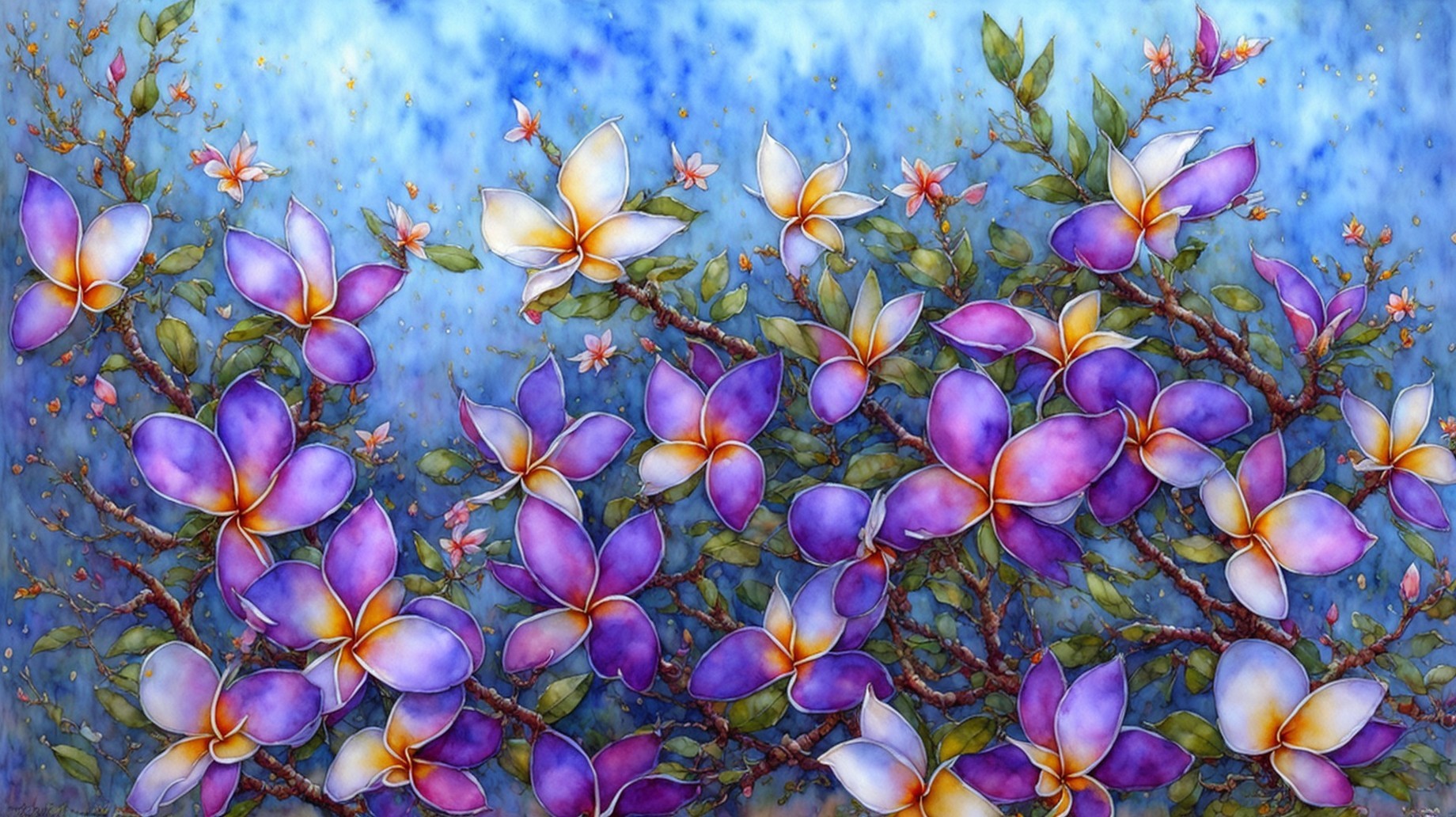 A vibrant painting of purple and pink frangipani flowers with green leaves set against a blue background with yellow accents.