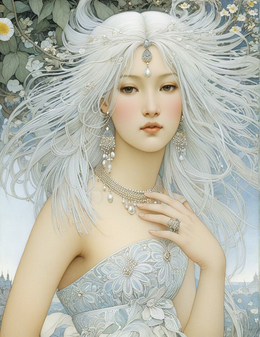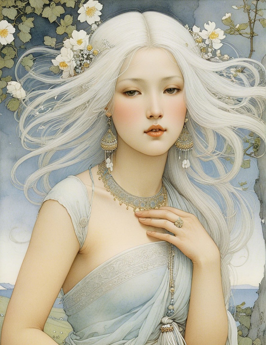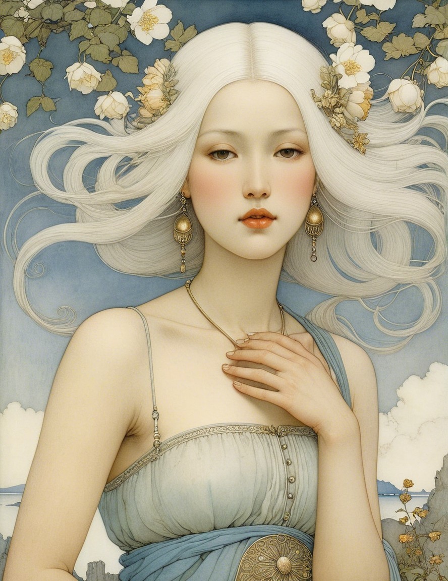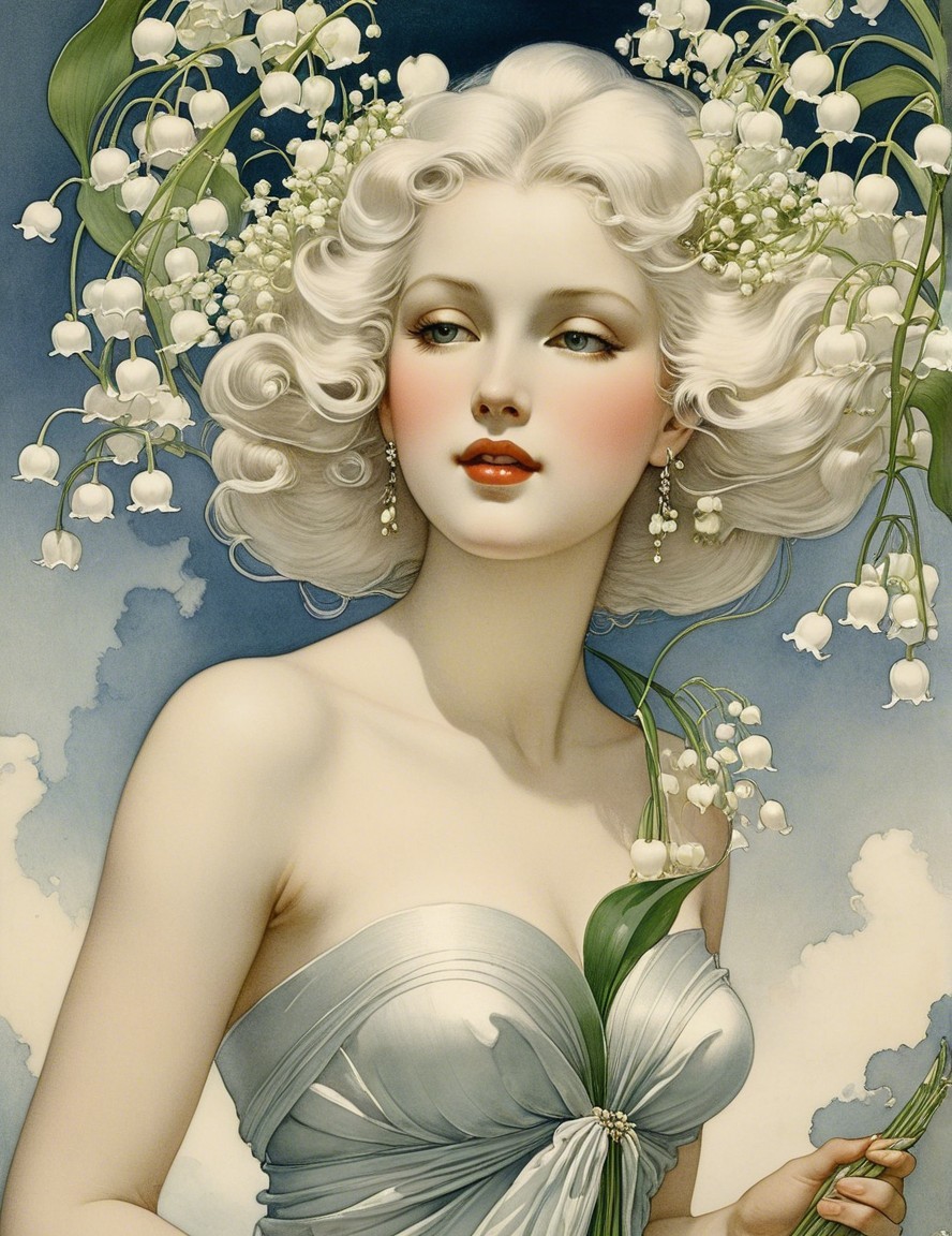 A stunning woman with flowing hair adorned with white lilies. She wears an elegant, draped outfit and has a serene expression, set against a soft, cloudy backdrop.