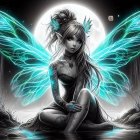 A mystical fairy with vibrant turquoise hair and shimmering wings emerges from a serene pond, surrounded by lush greenery and soft light, evoking a magical and enchanted atmosphere.
