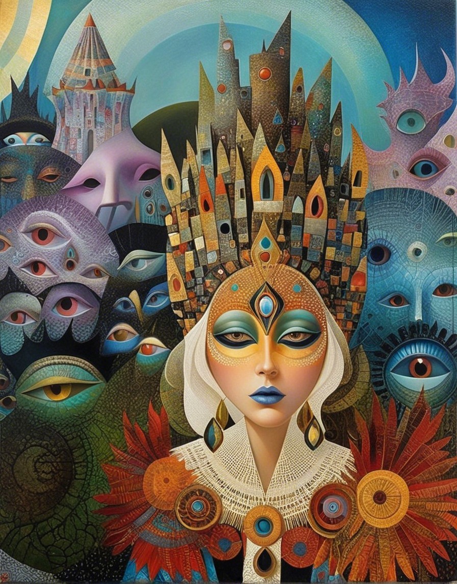 The artwork features a mystical figure adorned with a crown of architectural shapes and vibrant colors, surrounded by a surreal array of eyes and ethereal faces, evoking intrigue and wonder.
