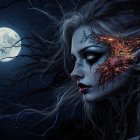 A captivating portrait of a woman with intricate blue face paint, surrounded by softly glowing autumn leaves. The background features a mystical forest ambiance with dim light.