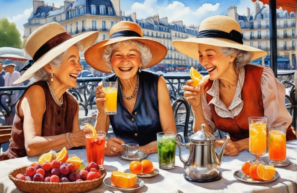 Three elderly ladies laugh joyously at a café, sipping colorful drinks on a sunny day, exemplifying friendship and happiness.
