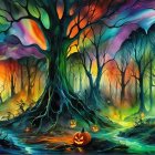 A figure in a long coat walks through a misty, colorful landscape. Warm lights glow from quaint houses, while vibrant autumn leaves contrast against the foggy backdrop of trees and lanterns.