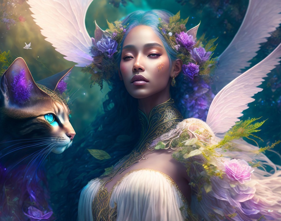 Full view portrait mystical ethereal herbs goddess with beautiful eyes wearing a beautiful dress, herbs dryad with flying majestic cats