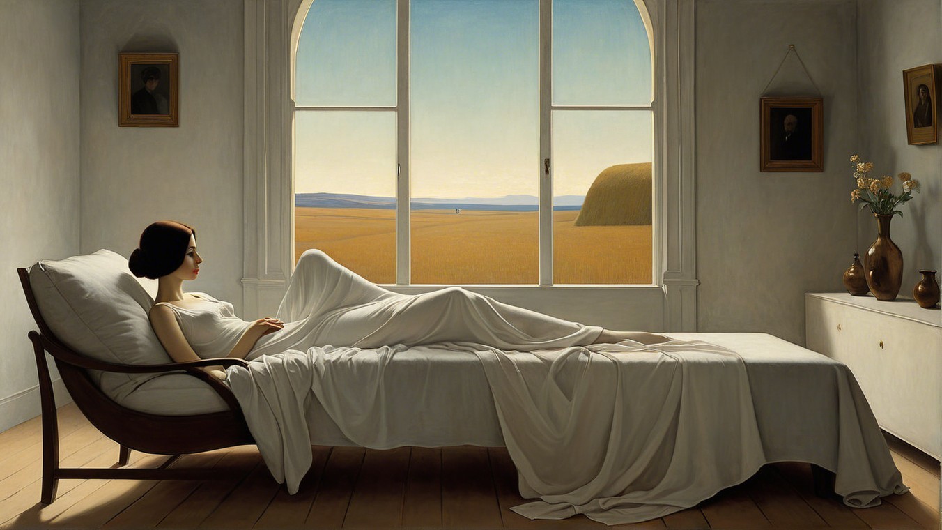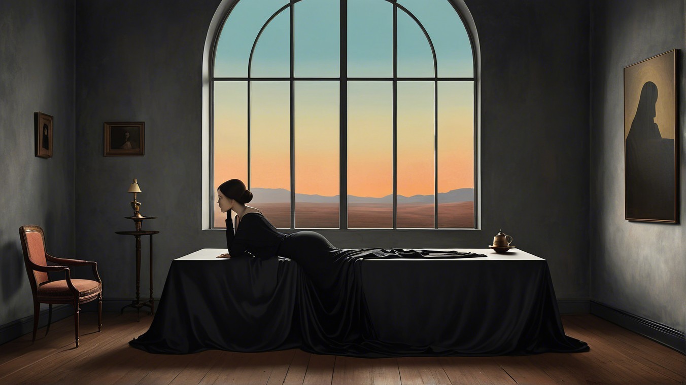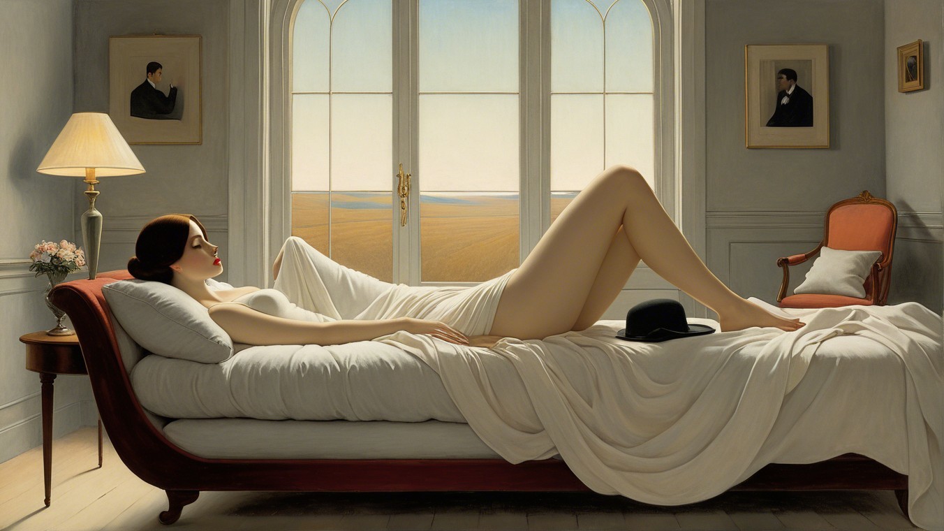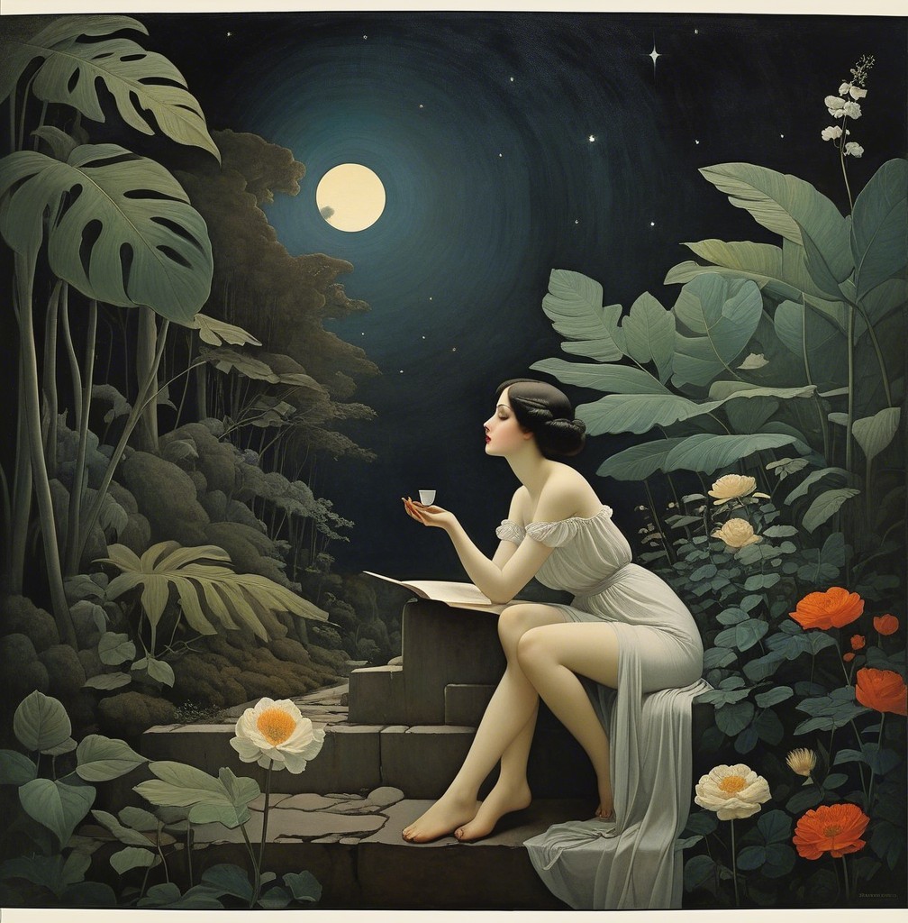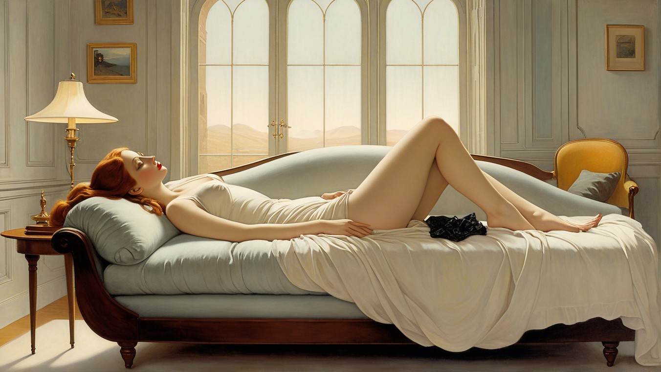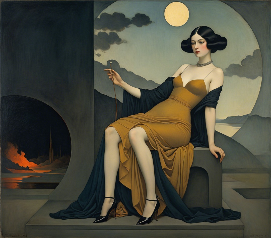 A woman in a striking orange dress lounges on a cream chair, exuding elegance. A candle flickers beside her, and the warm glow contrasts with the dark background, creating a captivating atmosphere.