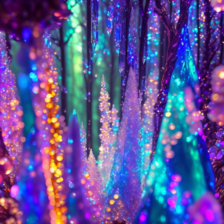 Vibrant blue, purple, and orange crystal structures with bokeh effect