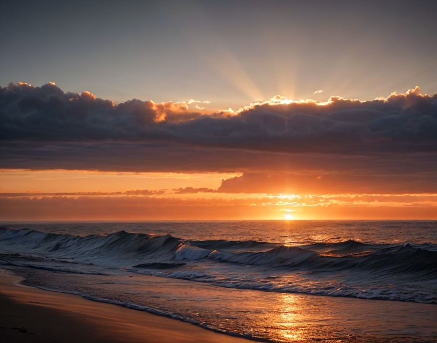A breathtaking sunset over the ocean, with vibrant hues of orange and gold illuminating the clouds, casting a warm glow on the waves gently lapping the shore. Peaceful and serene.