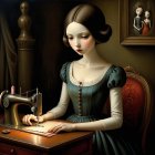 A young girl with vintage styling sits at a sewing machine, focused on her work. She wears a green dress with red buttons, surrounded by elegant decor and artful doll figures in the background.