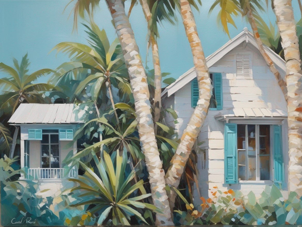 + Prompt:Create an oil painting of an old beach house in the Florida Keys with rustic white washed walls, teal hurricane shutters, situated within a jungle of palm trees and sea grape bushes. Use visible brush strokes to depict the varied colors that the whitewashed walls take in the light. In the style of Carol Rabe and Josef Kote.