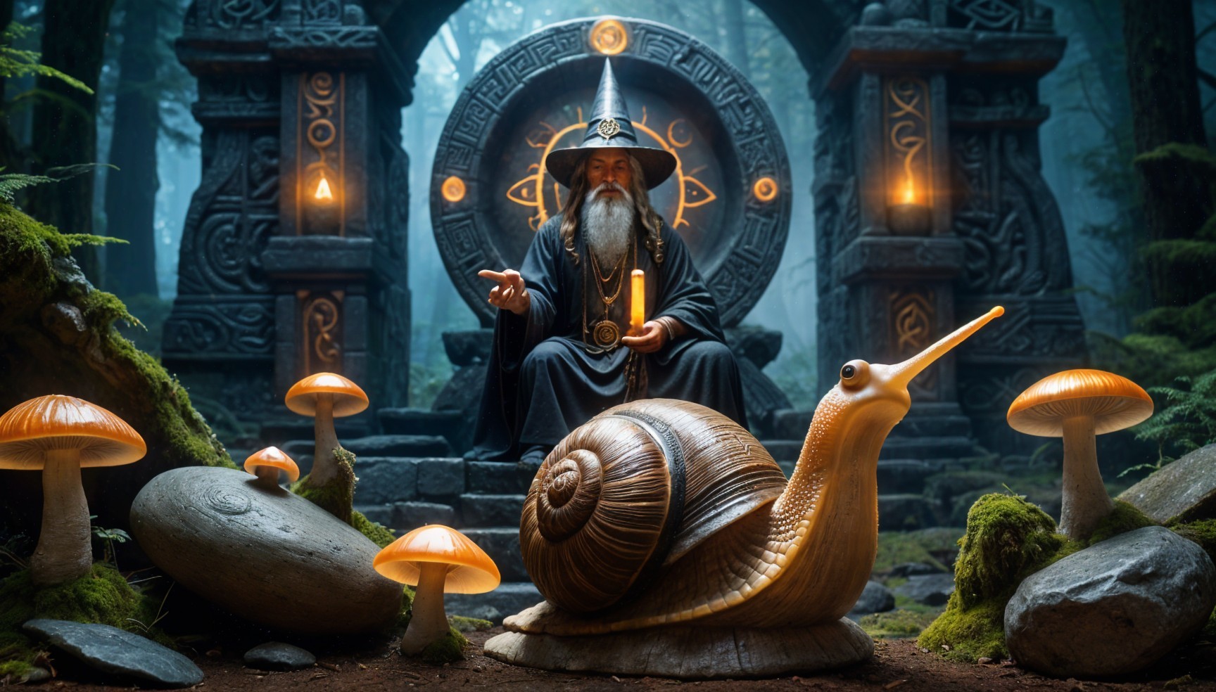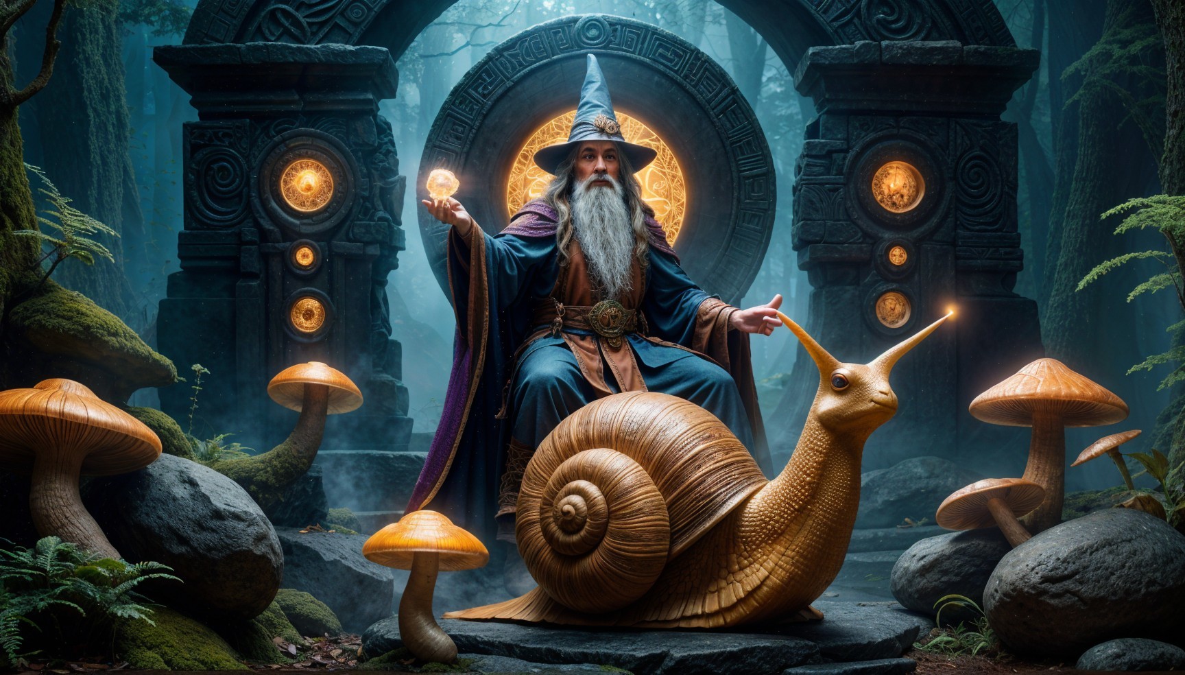 A mystical wizard with a long beard sits on a giant snail, surrounded by enchanted mushrooms and ancient stone carvings, holding a glowing orb in a lush, magical forest setting.