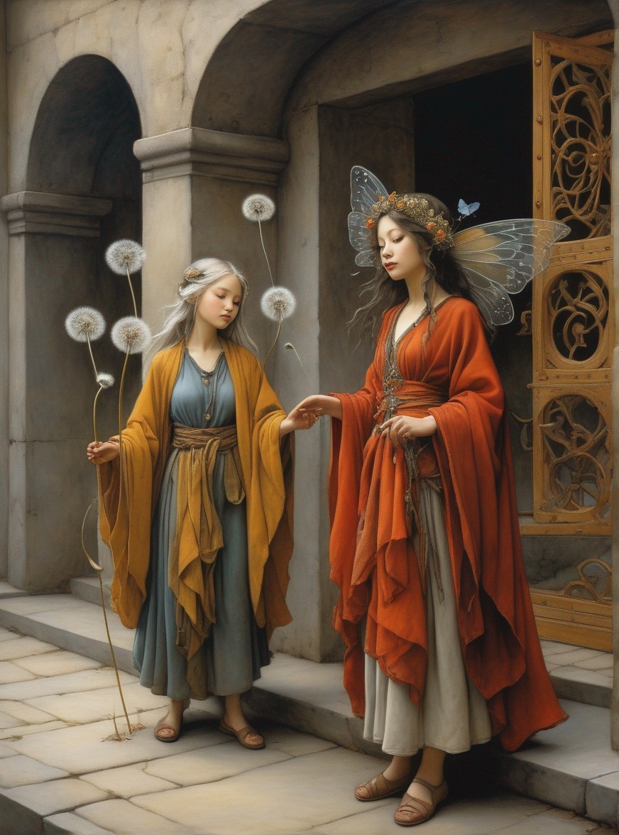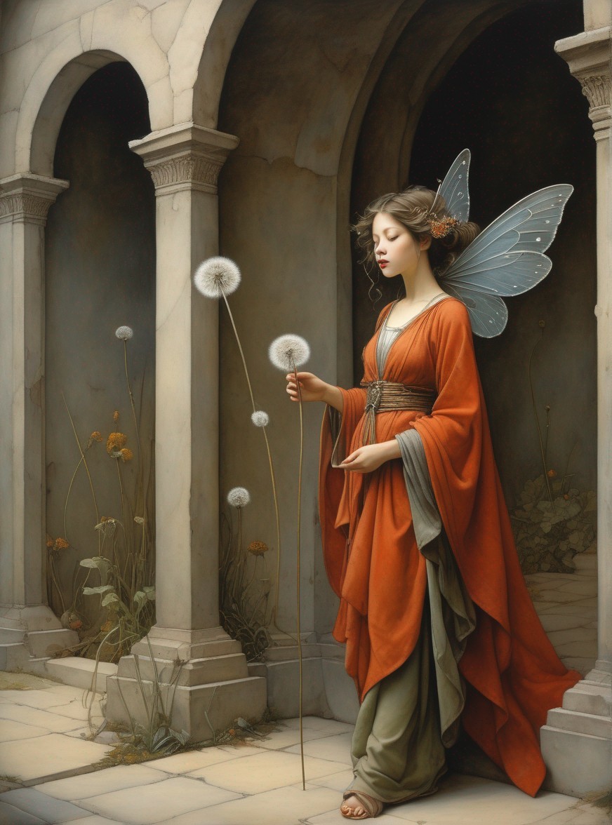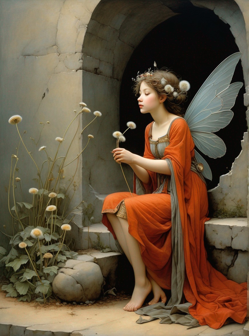 A painting of a fairy in an orange dress sitting beside dandelions, delicately holding one, with graceful wings and a serene expression.