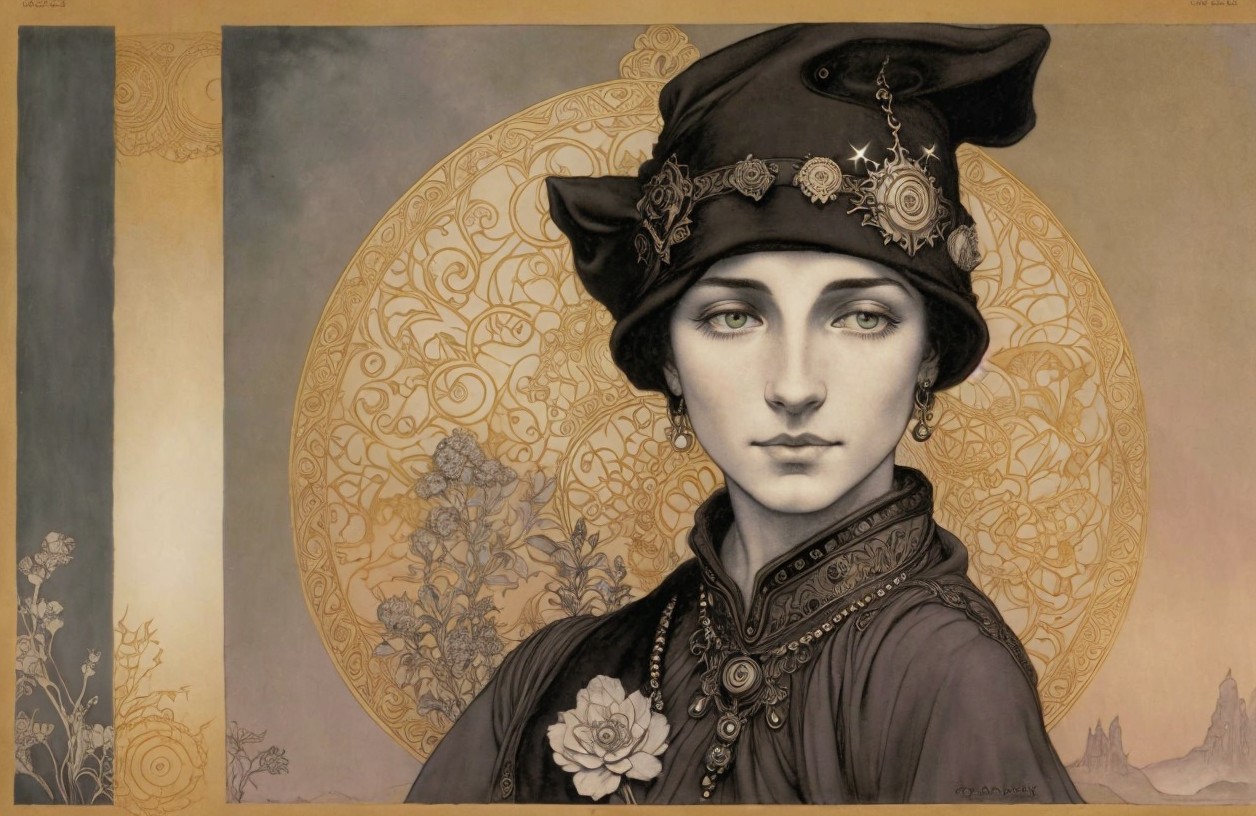 The image features a woman with an elegant hairstyle adorned with gemstones, set against a detailed, golden background resembling a map. Her expression is serene and captivating.