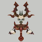 The image features a stylized skull with blue eyes, adorned with sharp, red horns and intricate armor-like details, coupled with symmetrical, curved blades on either side. Dark and fierce design.