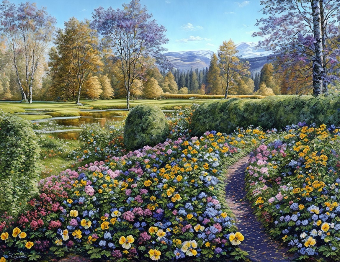 + Prompt:3D. Early spring, high level of detail, clear facial expressions, round bed with freshly planted pansies, bordered by a hedge, behind it a pond, park with a meadow and tall deciduous trees, birch, maple, spruce, further back a lake, in the background mountains, sunny, oil on canvas, extremely detailed, smooth, inspired by Gary Bukovnik