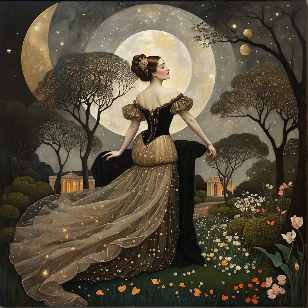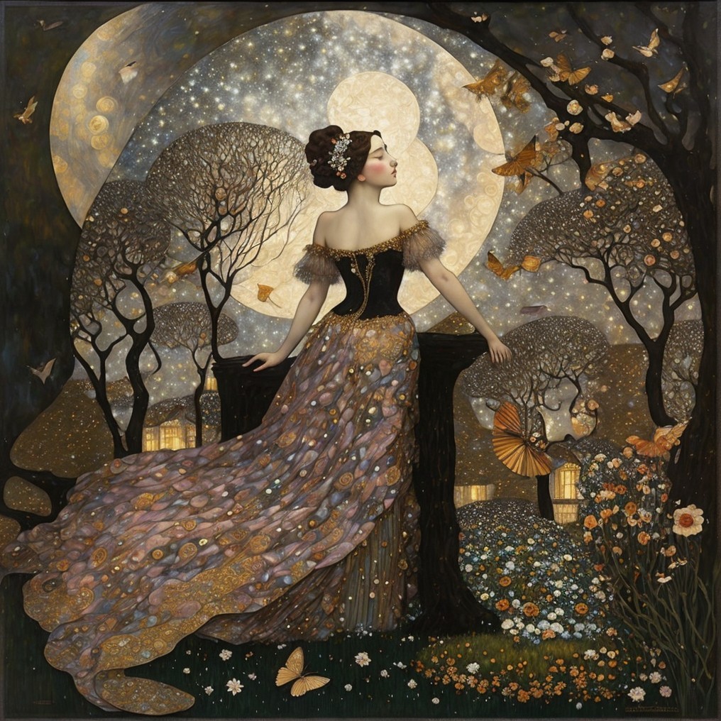 A graceful woman stands with her back to the viewer, wearing a flowing gown in gold and black, surrounded by a magical landscape of trees, a glowing moon, and vibrant butterflies.