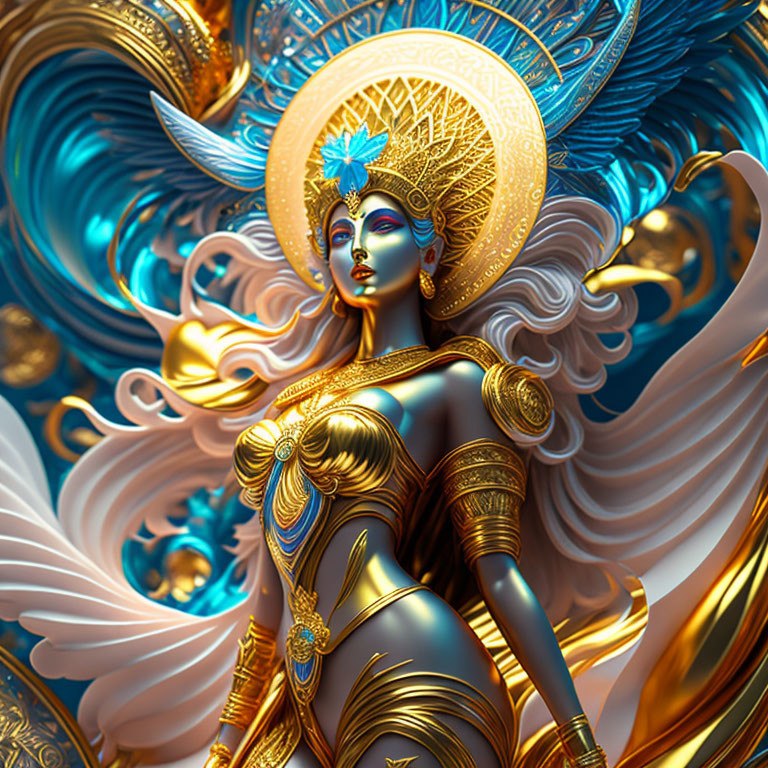 Detailed digital artwork: Female figure in golden armor with swirling blue elements on warm background