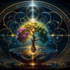 A mystical tree stands at the center, surrounded by swirling golden patterns and vibrant cosmic elements. Radiant colors blend, creating an ethereal atmosphere of harmony and growth.