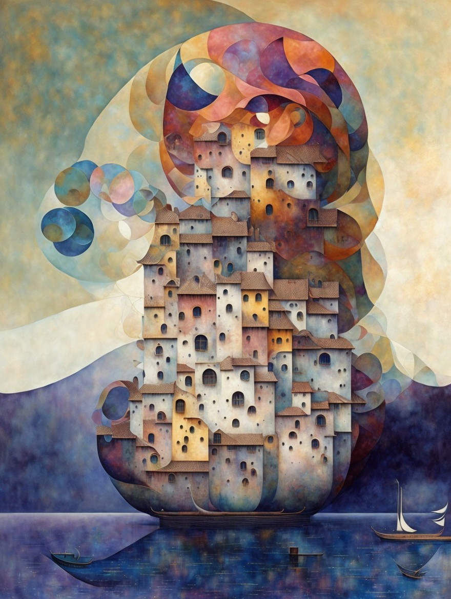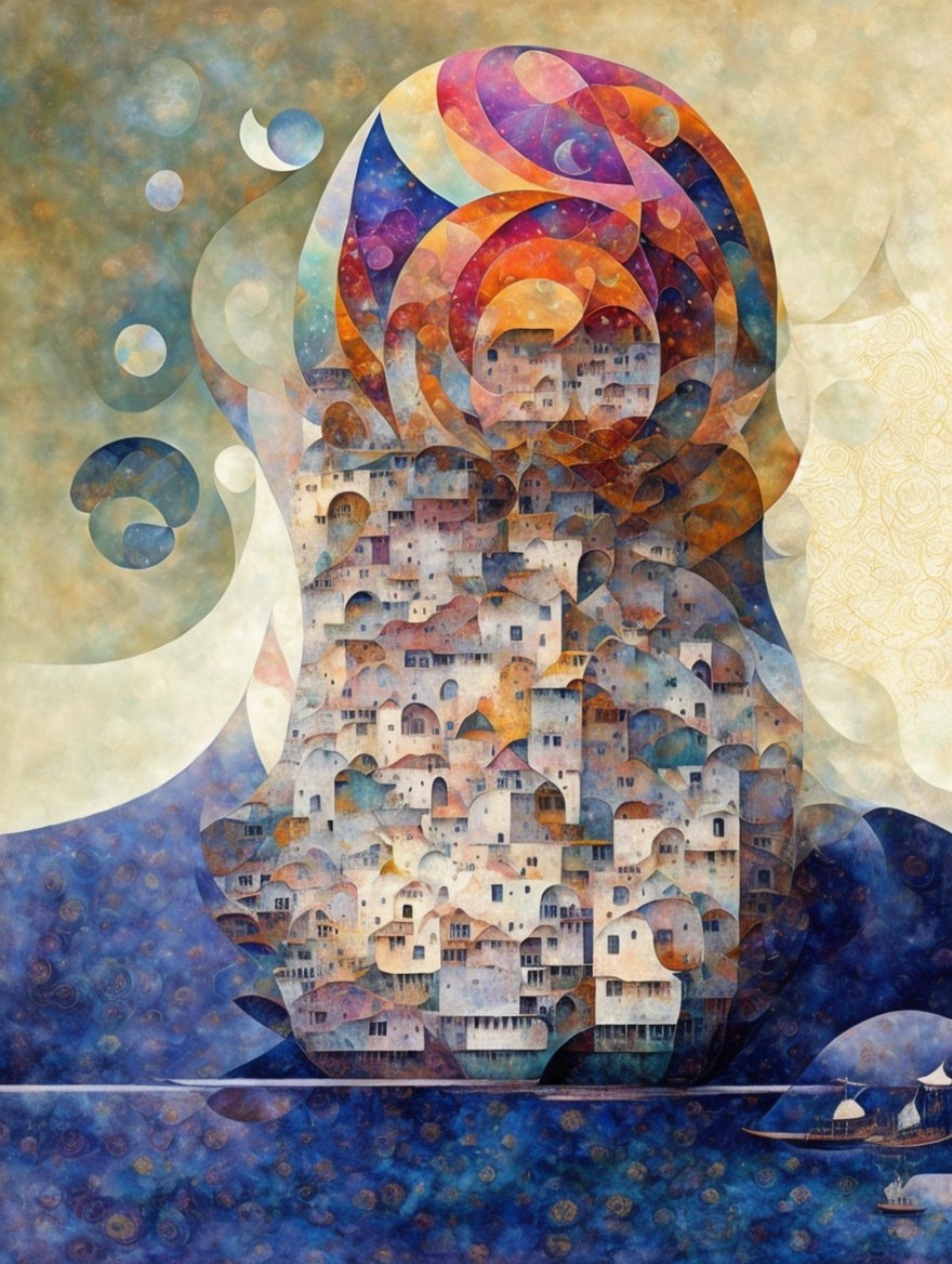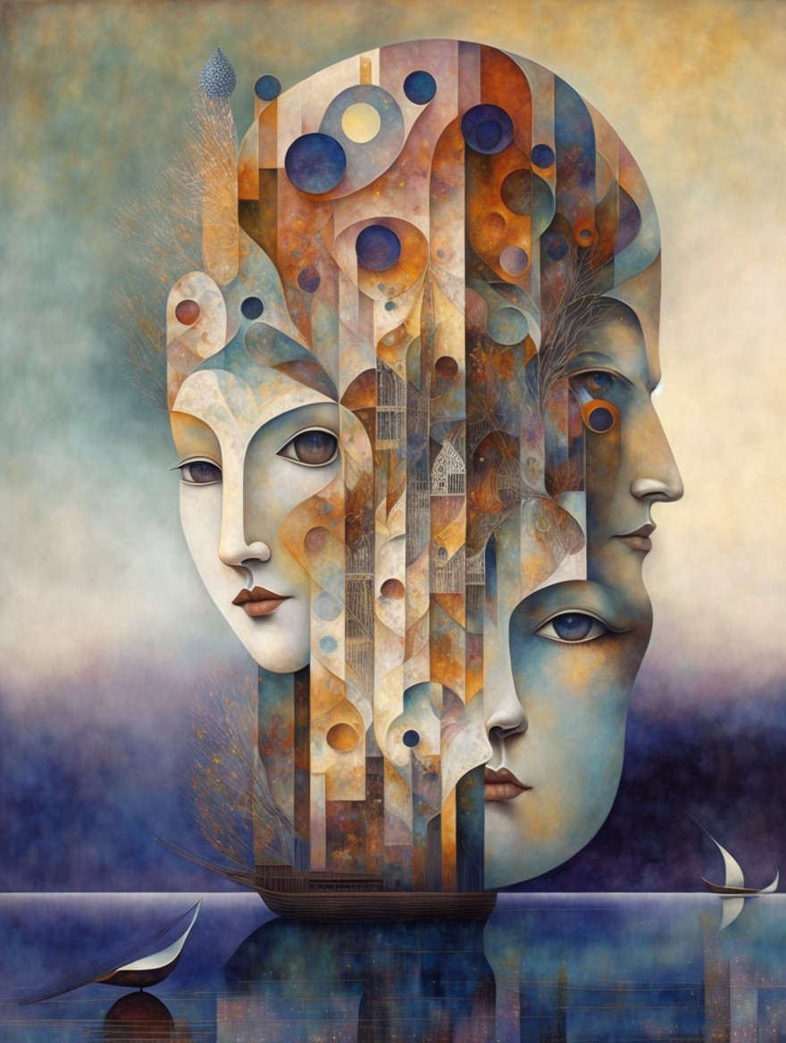 Surreal painting: Faces merged with autumn trees, ship, moon
