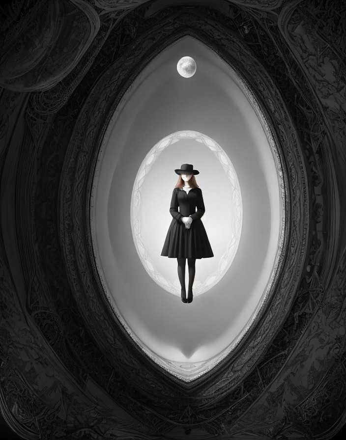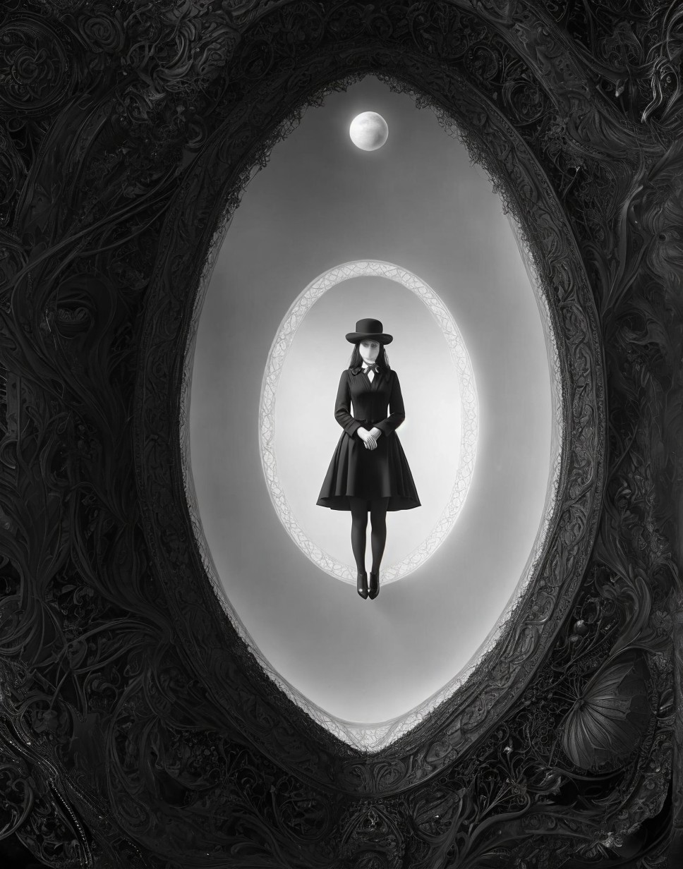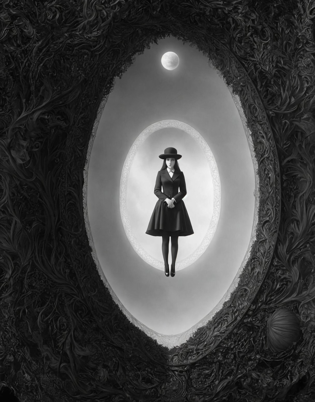 151515;[In the style of Rene Magritte, a surreal artwork depicts a young woman seen from above, evoking a dreamlike perspective. Exaggerated features and floating in an abstract space. Intricate lines, monochromatic color scheme, creating a mysterious atmosphere. Highly detailed, surrealistic ambiance]