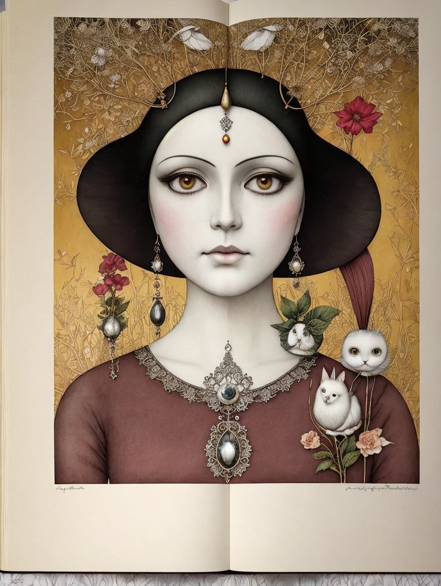 The image features a woman with striking, large eyes and a floral headdress. Intricate patterns surround her, while elegant birds accompany her in a harmonious, ethereal composition.