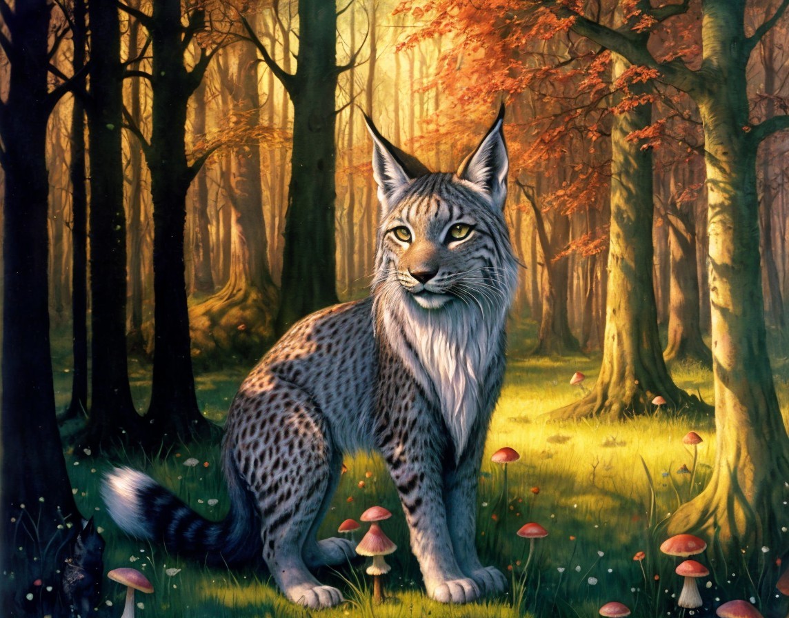 Prompt: "High Gothic Dark Fantasy water color , Fairytale lynx in a Grass clearing meadow next to a shallow river next to a Dark Towering dense overtowering dark oak Forest with toadstool red mushrooms under a bright warm Sunlight"oil painting by James Gurneyby Rosina Wachtmeister, Gustav Klimt and Marc Chagall. Metallic paint. mixed media. extremely detailed colourful acrylic art collage fine art cosmic Gustav Klimt impasto Metallic John Everett Millais william morris translucent by Paul Klee Odilon Redon BILL SIENKIEWICZ synesthesia Visible brushstrokes Transparent mixed media art interesting textures imprecise multimedia mercury glass