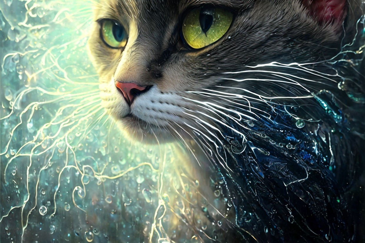 Prompt: 151515:[beautiful cat, Insanely detailed and intricately dressed with lightning, rain, clouds and fire. Beautiful face with intense eyes, hyperdetailed mysteriously magical, highly intricate, hyperrealism, by Tom Bagshaw, Asher Brown Durand, Beeple, Todd McFarlane, Ralph Steadman, Anna Dittmann, Dan Mumford, Magali Villeneuve, Christoper Lovell]