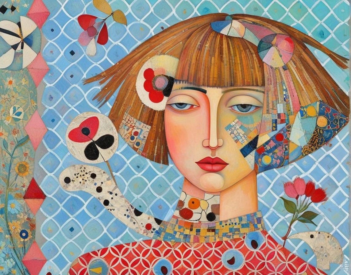 This artwork features a stylized figure with geometric shapes and a vibrant color palette, combining elements of abstraction and whimsy, set against a textured blue background.