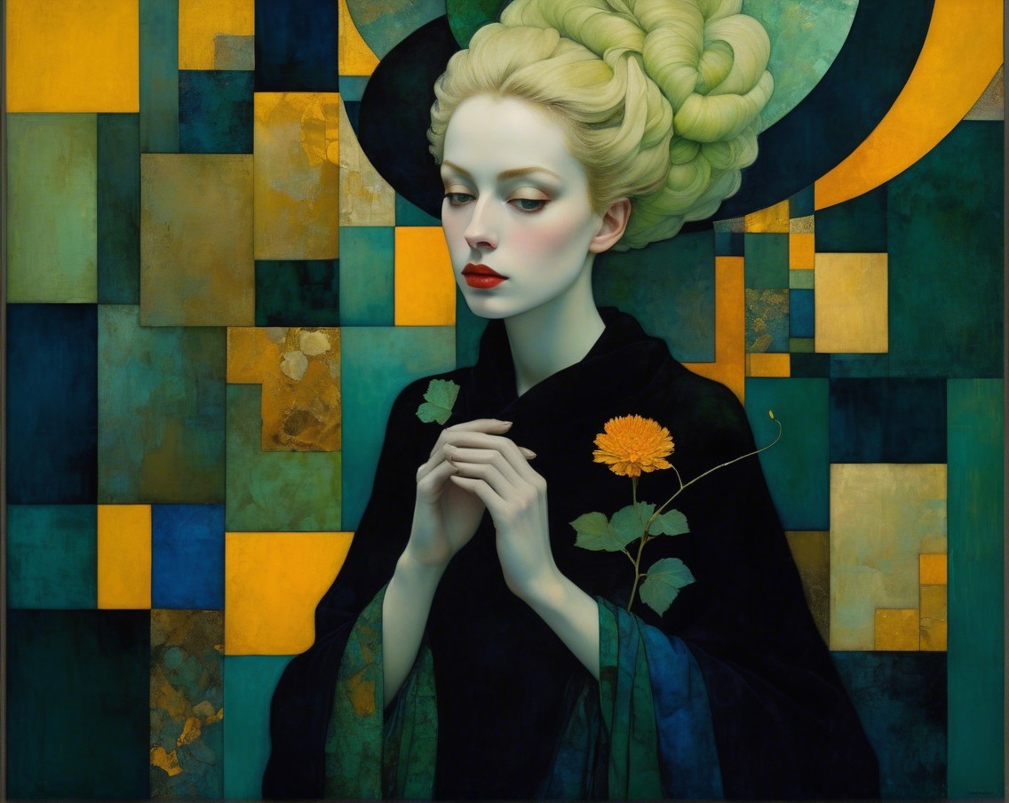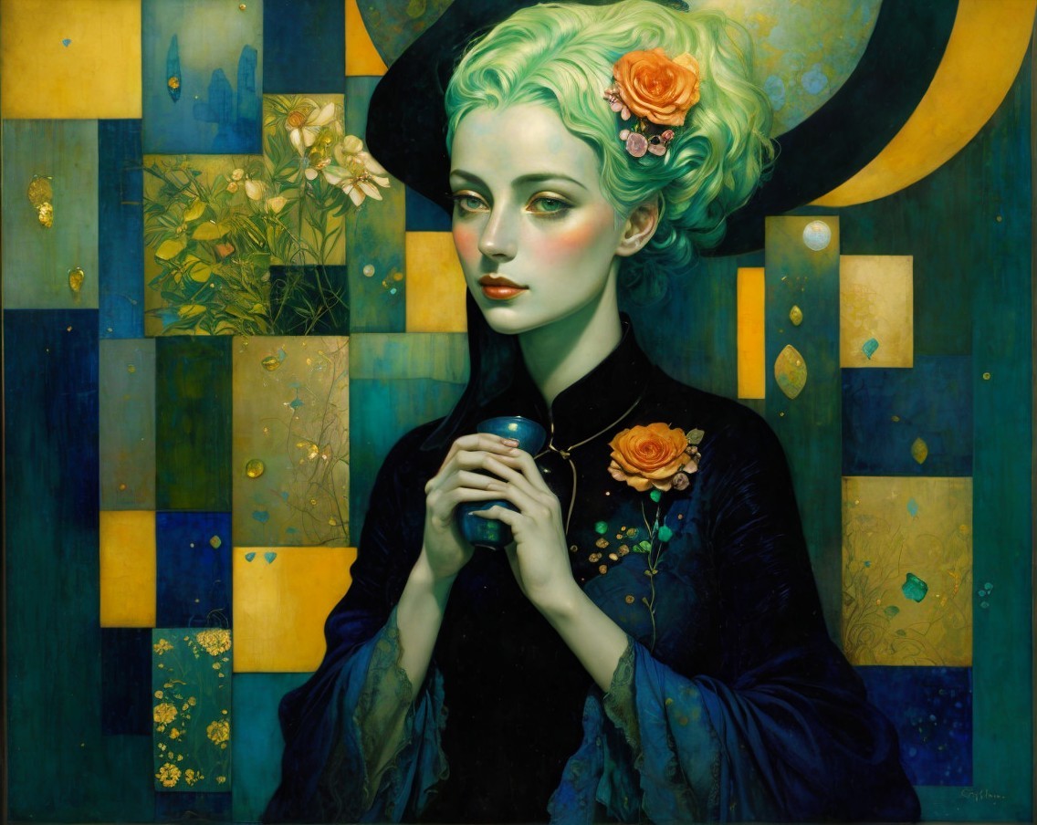 This artwork features a striking woman with vibrant green hair and a flower accessory, set against a geometric background of soft colors and textures, evoking a sense of elegance and mystery.