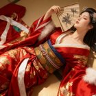 A woman lounges elegantly on the floor, wearing a stylish red satin outfit with white accents. She holds a cigarette, creating a soft cloud of smoke, exuding a relaxed yet edgy vibe.