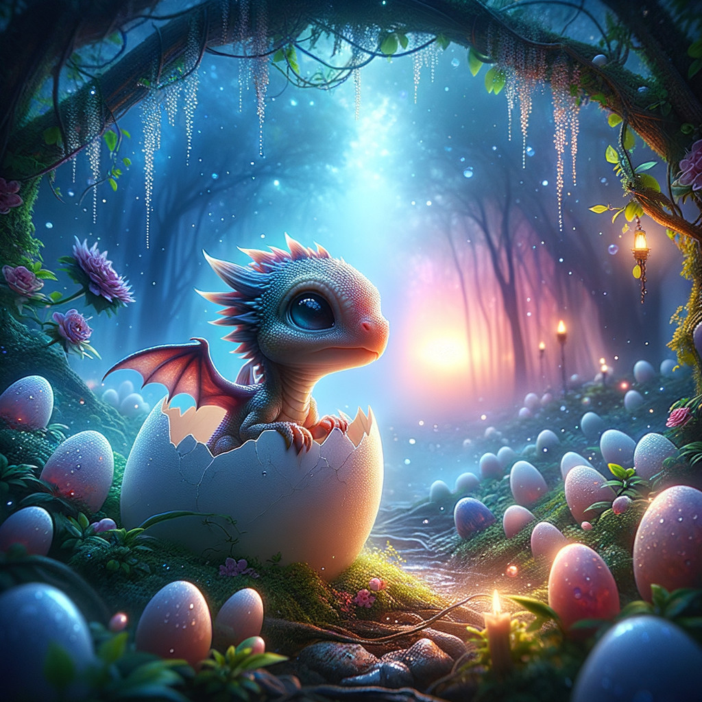 pretty little girl with an adorable baby dragon that has just hatched from an egg, mystical forest, magical, whimsical, serene, quiet morning fog, dew, blue hour, rosy dawn and starry night, echo