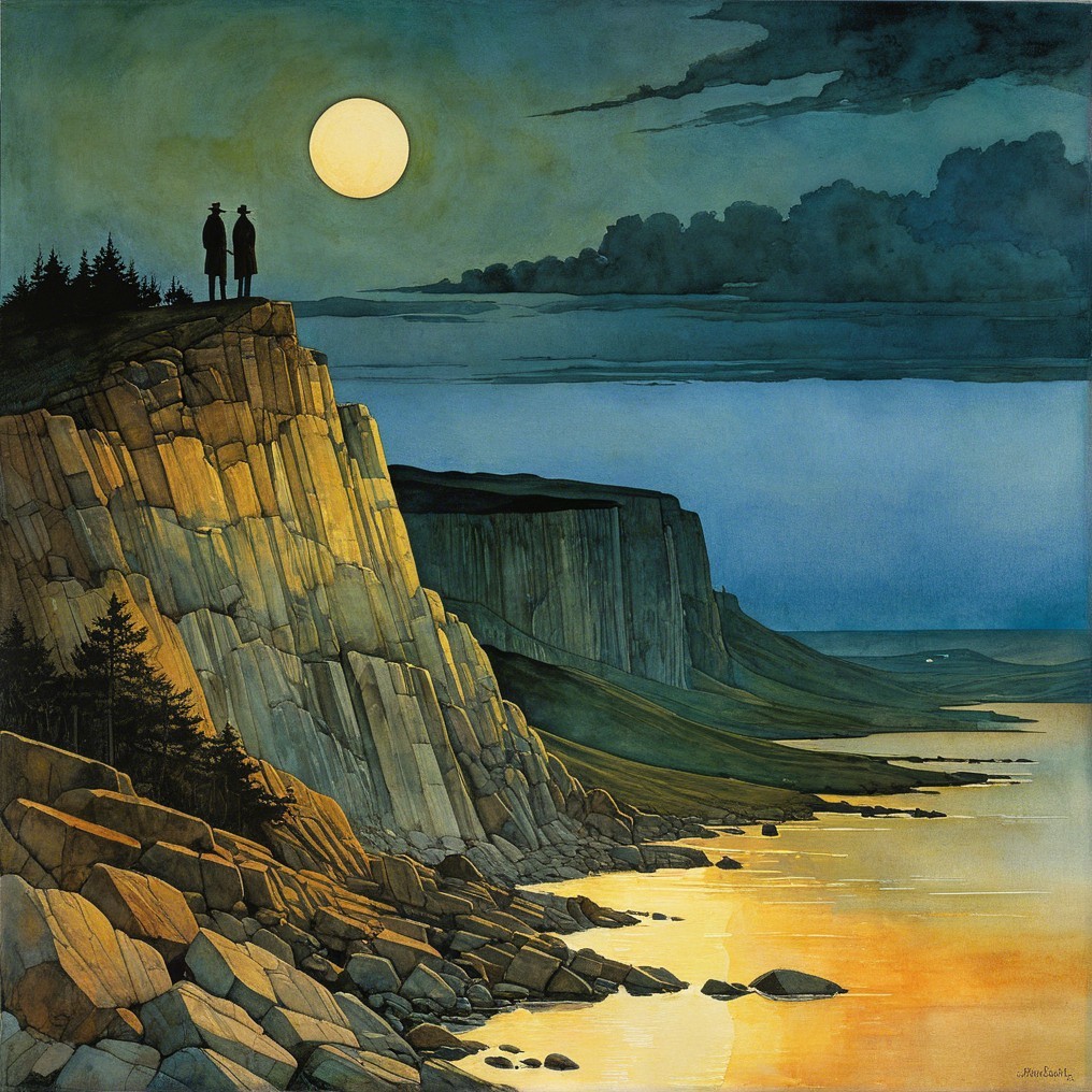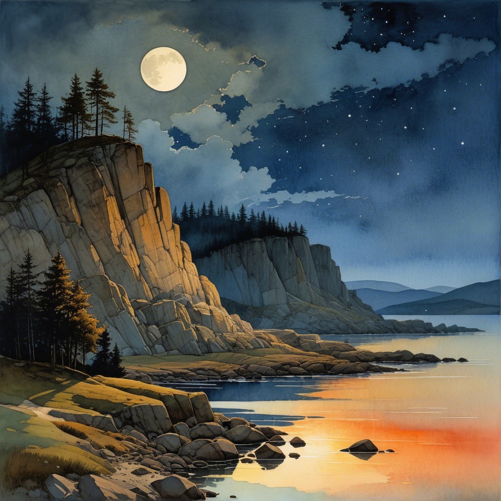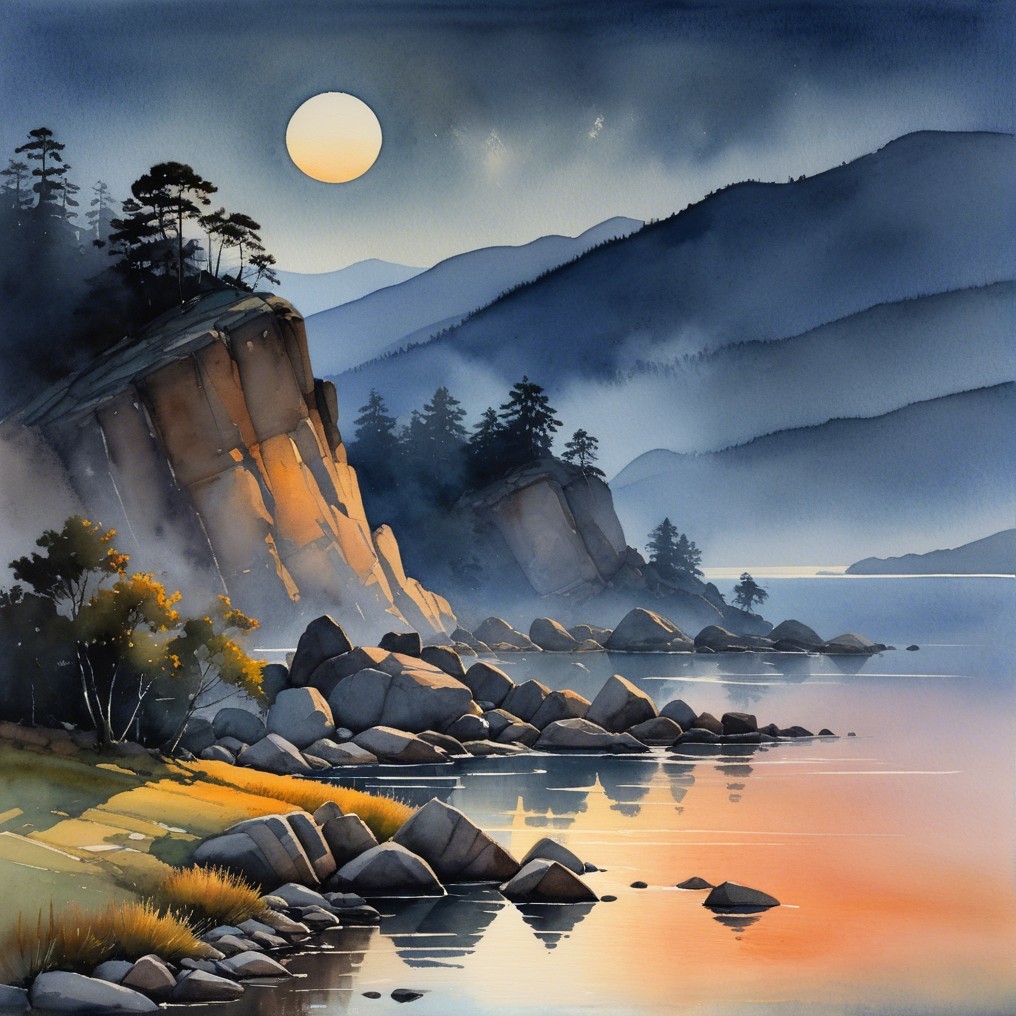 A serene lakeside scene at dusk, featuring a cozy cabin with warm light glowing from its window. The moon reflects on calm waters, framed by mountains and trees, creating a tranquil atmosphere.