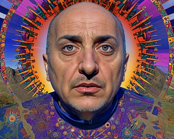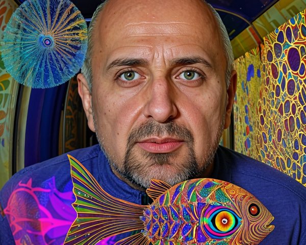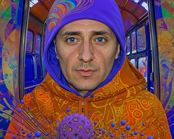 A person in a vibrant costume featuring a mask, styled blonde wig, and striking makeup poses against a colorful background with geometric shapes. The outfit combines elements of fantasy and sci-fi.