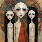 The image features three stylized figures with elongated heads and pale skin, set against a muted backdrop of trees. One figure wears a red garment, while the others are in white, conveying a serene yet enigmatic mood.