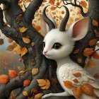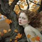 A woman with flowing red hair gazes softly amidst a backdrop of a gnarled tree and vibrant orange leaves, evoking a dreamy autumn atmosphere and a sense of serene beauty.