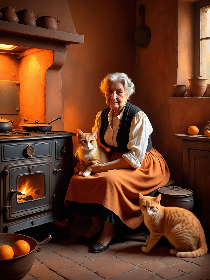 (Try from Vincent Godard) - In a warm, rustic kitchen, an elderly woman sits on a stool beside a vintage stove. Two orange tabby cats are nestled close to her, while oranges rest in a bowl nearby. The ambiance is cozy and inviting.
