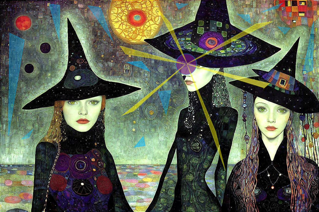 Abstract art with three figures resembling witches in pointy hats and decorative attire against a mosaic background with vibrant circles and patterns.