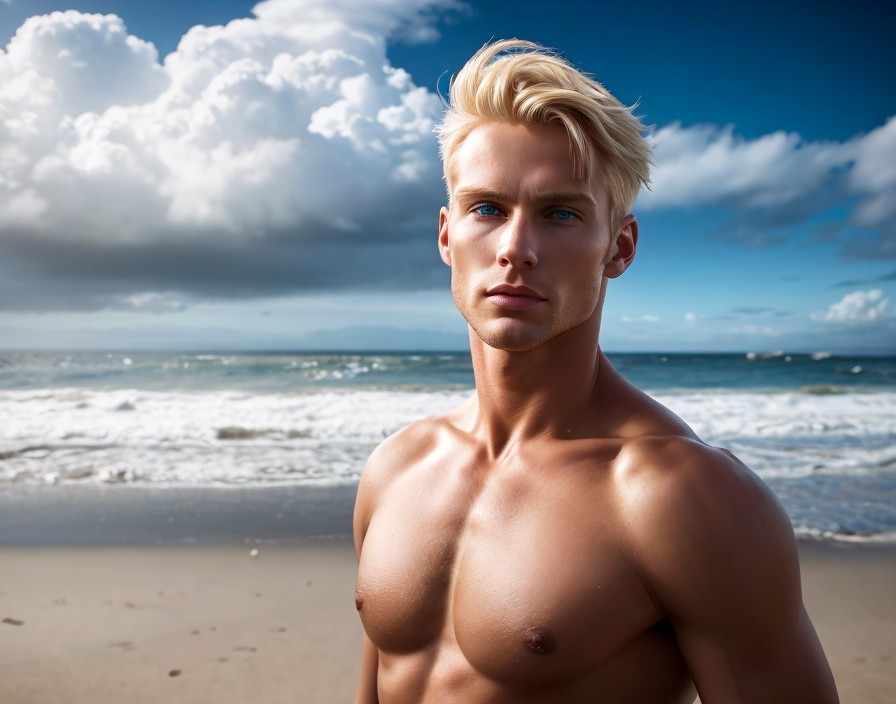 A muscular man with blond hair stands on a beach under a cloudy sky, gazing into the distance.