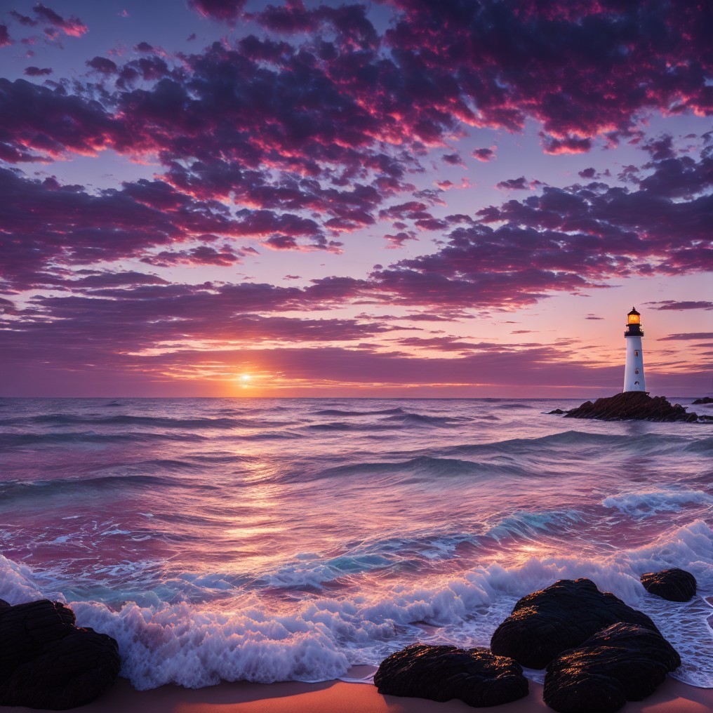 A tall large vintage up close lighthouse on a sunset beach. Glistening glittering water