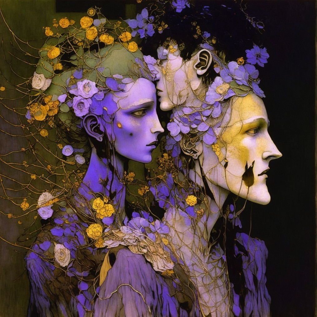 The artwork features three figures with striking, painted skin tones and detailed accessories. Their expressions convey a blend of emotion, with a regal ambiance enhanced by a golden color palette.