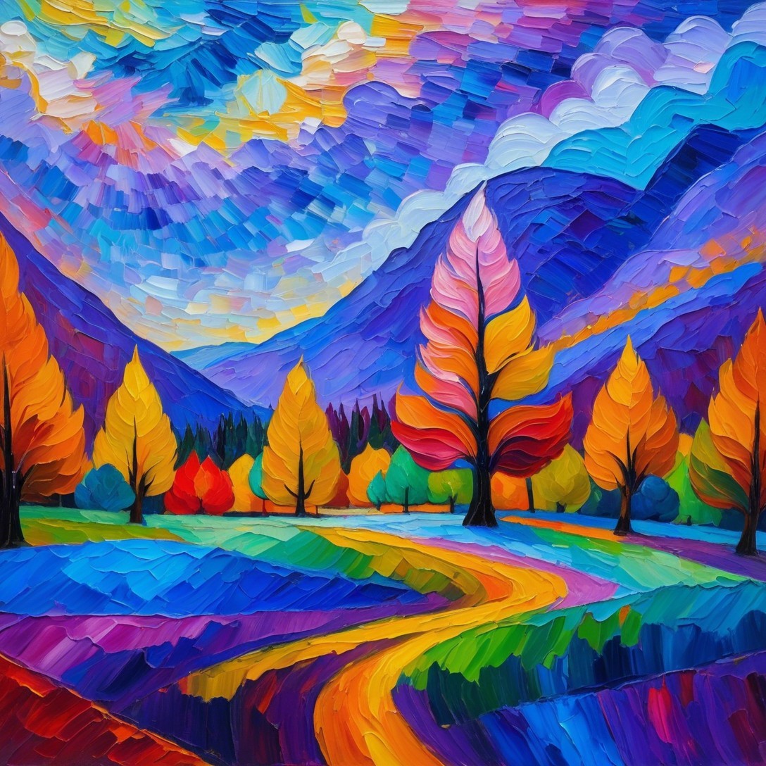 A vibrant landscape painting features rolling hills, colorful trees in autumn hues, and a winding path under a bright, swirling sky. Rich textures and bold colors create a lively atmosphere.