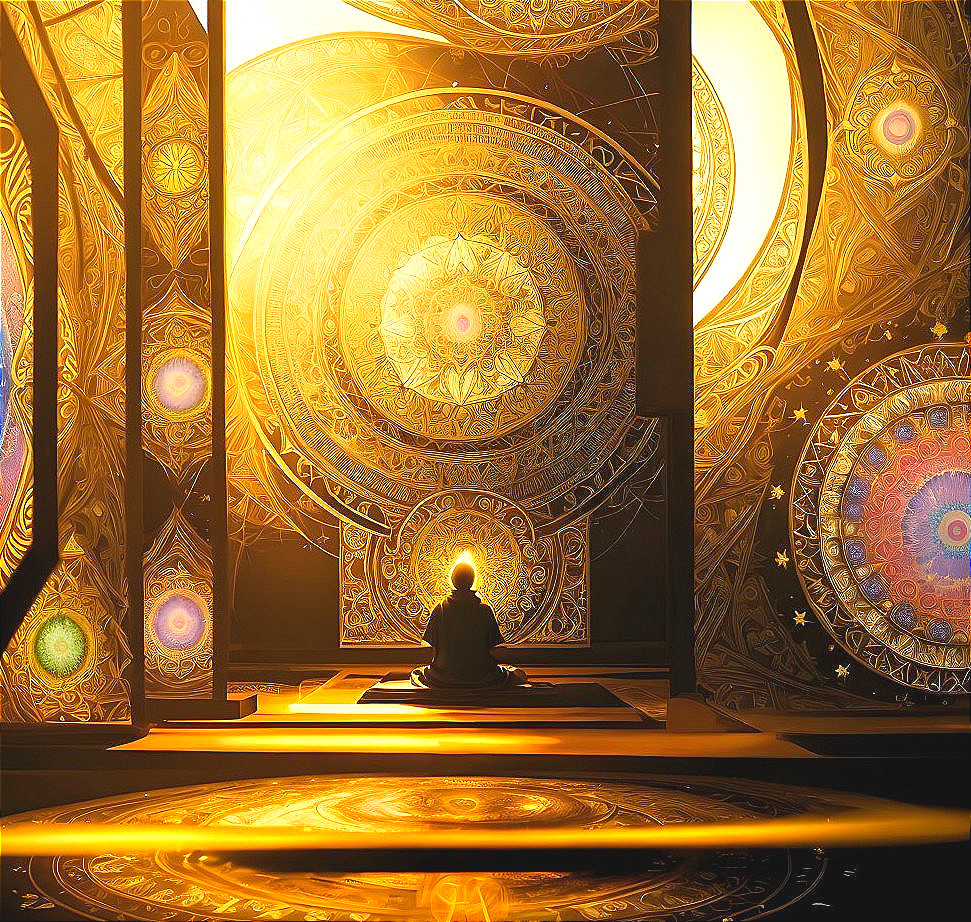 A person meditates amid intricate, glowing mandalas in a sunlit, mystical room with ornate patterns and columns.
